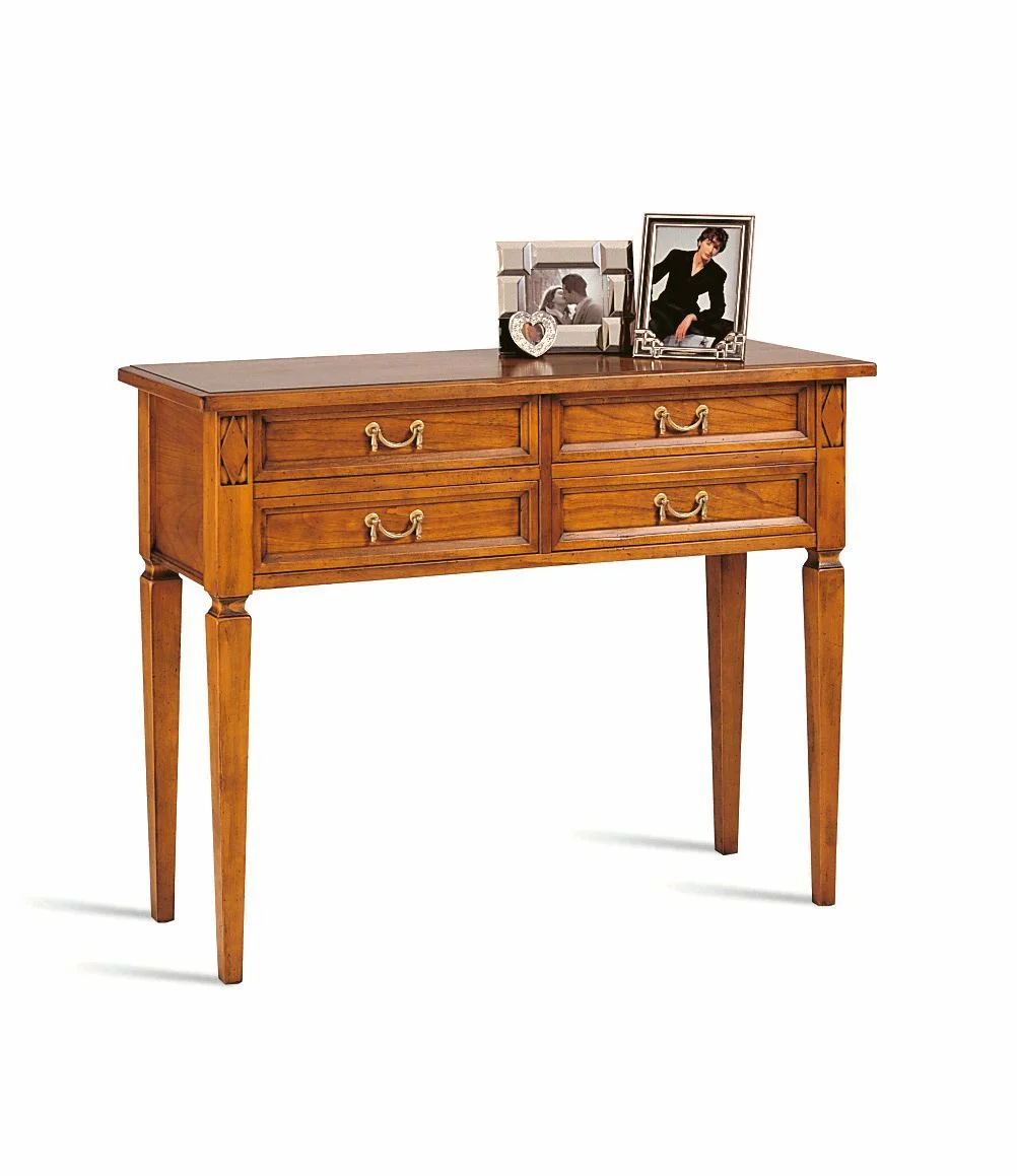 Verleihen Sie Ihrem Zuhause stilvolle Raffinesse mitdiesem edlen Konsolentisch im Directore-Desin.Hergestellt in Italien, verkörpert dieses Meisterstück klassische Eleganzund höchste Handwerkskunst.Gefertigt aus massiver Buche und veredelt mit Kirsche-Echtholzfurnier,strahlt der Tisch Wärme, Charakter und zeitlose Schönheit aus.Mit seinen vier praktischen Schubladen bietet der Konsolentisch großzügigen Stauraumfür Alltagsgegenstände,während seine klare Linienführung und die feine Verarbeitungden unverwechselbaren Directore-Stil unterstreichen.Die harmonische Kombination von Funktionalität und Ästhetikmacht ihn zu einem Blickfang in jedem Wohnraum,Flur oder Arbeitszimmer.Ob als elegante Ablage im Eingangsbereich oder als dekoratives Möbelstückim Wohnzimmer – dieser Konsolentischbringt das Flair klassischer italienischer Möbelkunst in Ihr Zuhauseund setzt ein stilvolles Statement.