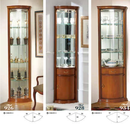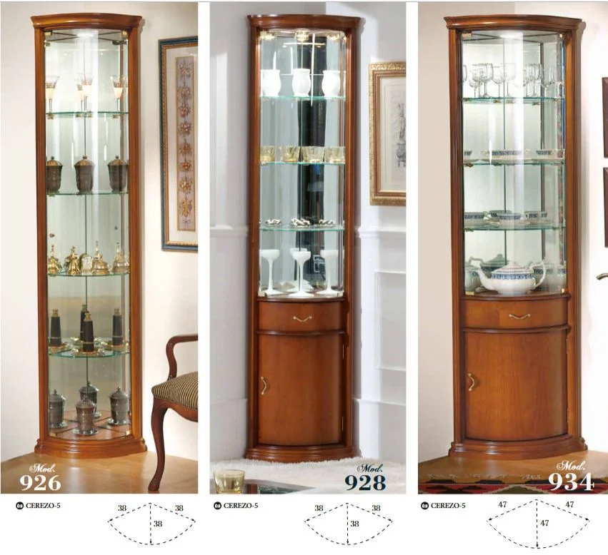 - Verleihen Sie Ihrem Zuhause einen Hauch von Luxus mit dieser exquisiten Eckvitrine aus italienischer Kirsche. Mit ihrer edlen Halbrunden Glasfront wird Ihre Sammlung von Lieblingsstücken auf stilvolle Weise ins rechte Licht gerückt. Die massive Tür bietet dabei nicht nur Stabilität, sondern auch eine hervorragende Möglichkeit, Ihre Schätze sicher zu präsentieren.Die verspiegelte Rückwand verstärkt den visuellen Eindruck und lässt die Objekte in der Vitrine noch eindrucksvoller erscheinen. Ein weiteres Highlight ist die praktische Schublade mit hochwertigem Echtholzfurnier, ideal für die Aufbewahrung von kleineren Gegenständen oder Zubehör.Mit ihrer zeitlosen Eleganz fügt sich diese Vitrine harmonisch in jedes Interieur ein und wird zu einem echten Blickfang in Ihrem Raum.