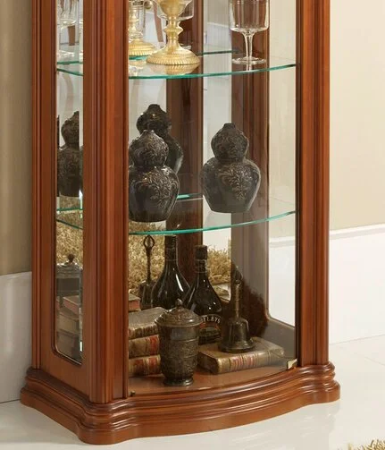 Verleihen Sie Ihrem Wohn- oder Essbereich einen Hauch zeitloser Eleganz mit dieser schmalen klassischen Vitrine mit bodentiefen Glastüren und Seitenverglasung. Gefertigt aus hochwertigem Massivholz und veredelt mit feinen handwerklichen Details, vereint dieses Möbelstück traditionelle Formen mit luxuriöser Ausstrahlung.